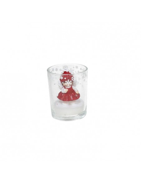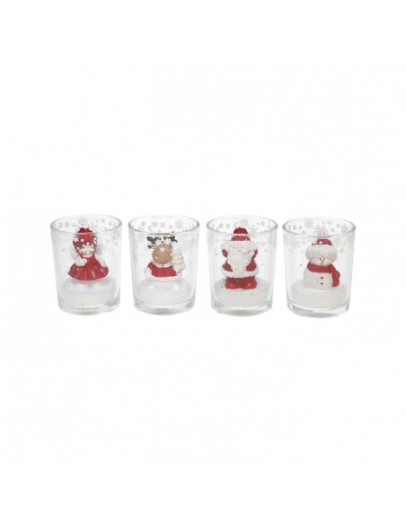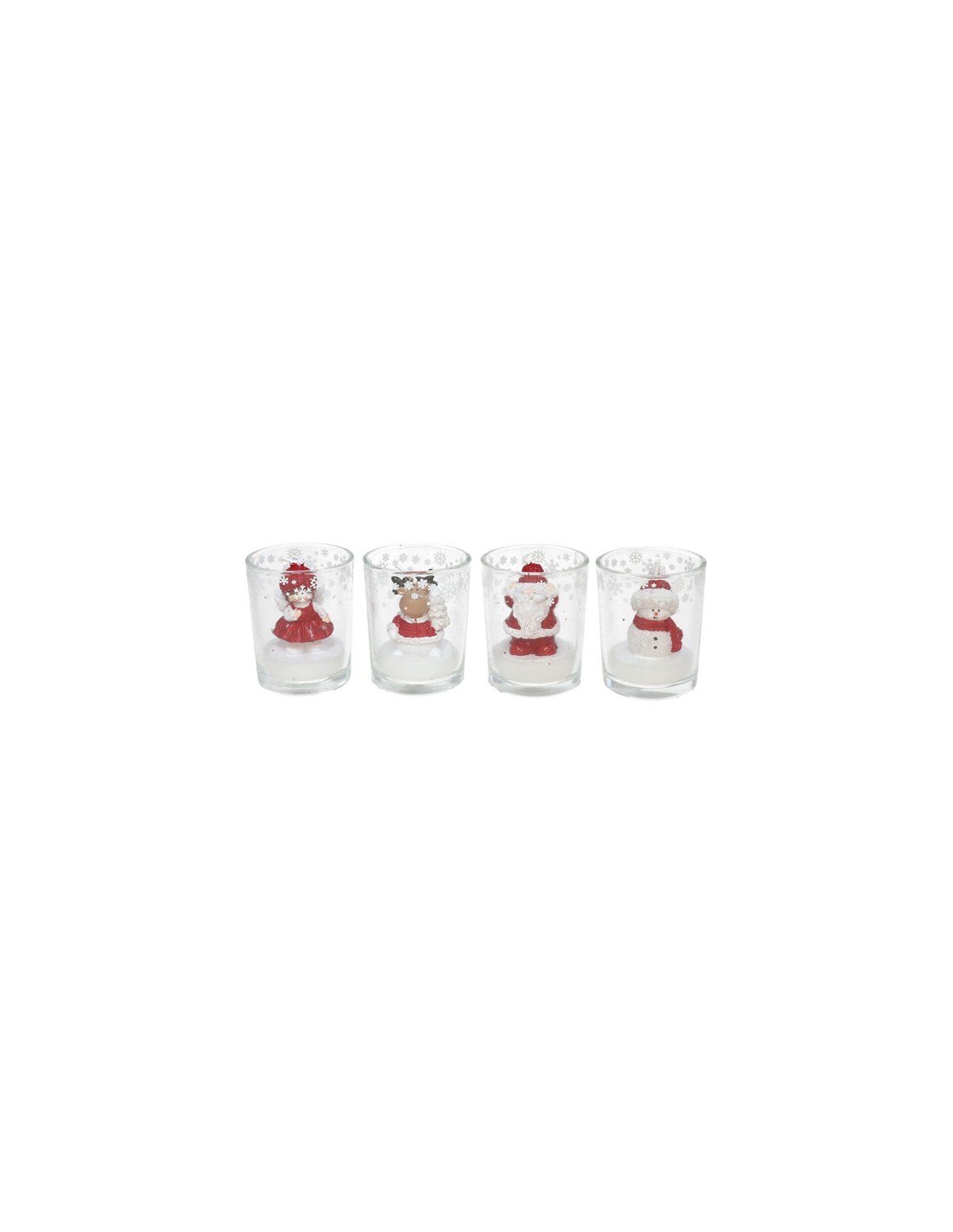 Vela decorativa en vaso de cristal con divertidas figuras navideñas en su interior, como Papá Noel, renos, muñecos de nieve o duendecillos, rodeadas de copos de nieve y detalles en blanco y rojo.