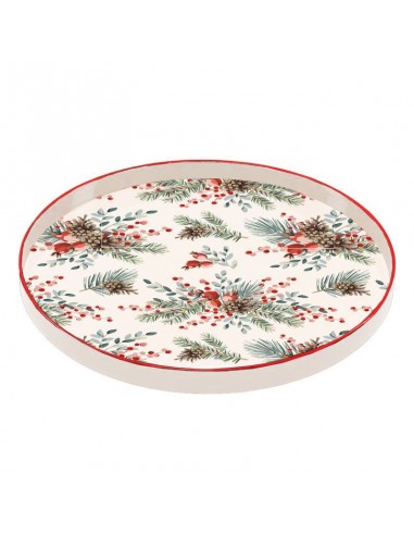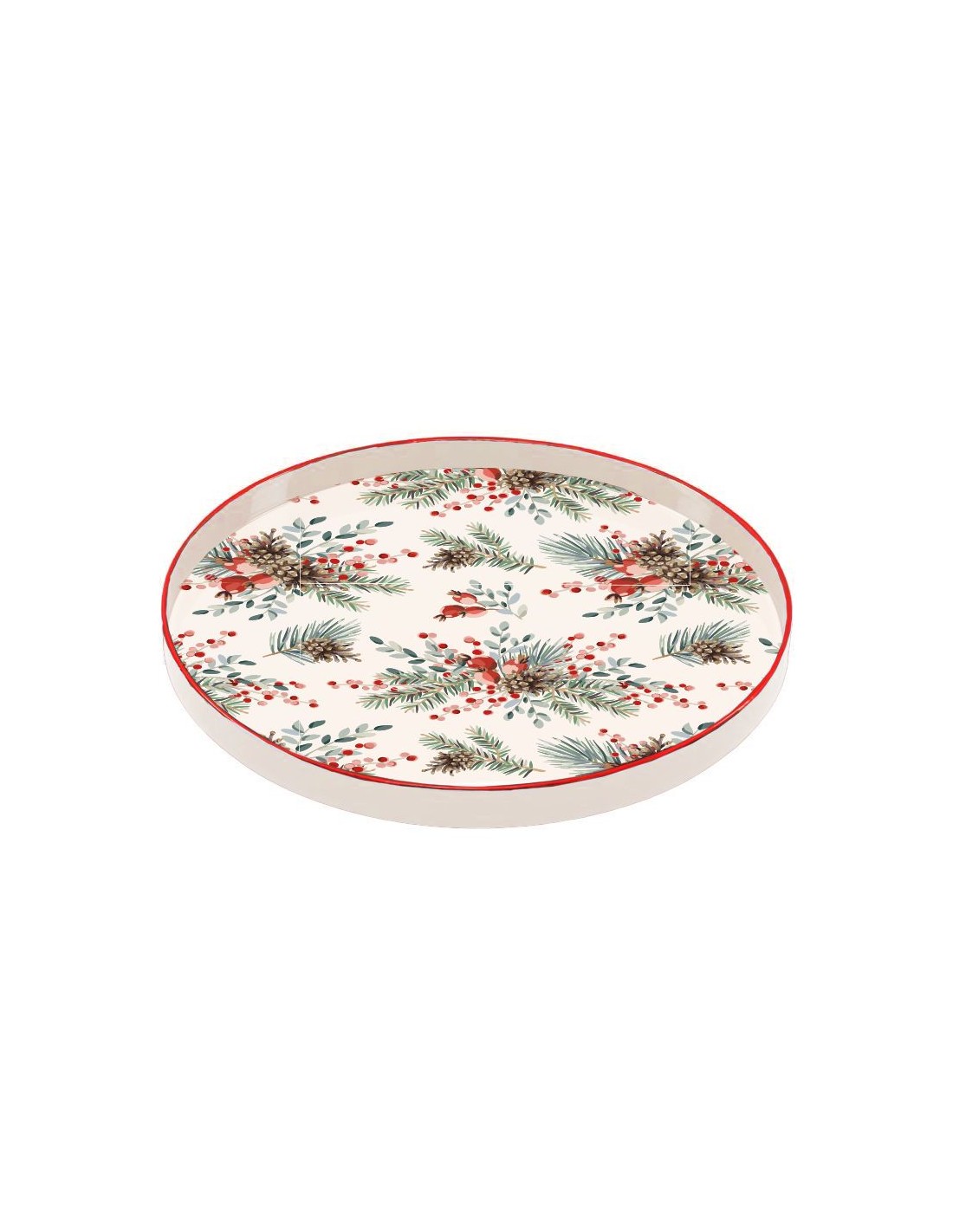 Con un bonito estampado de ramas, piñas y bayas rojas, esta bandeja redonda aporta un aire natural y festivo a la mesa. Su borde en rojo resalta el diseño y le da un toque elegante y navideño. Fabricada en melamina resistente, es ligera, fácil de limpiar y perfecta tanto para servir como para decorar cualquier rincón del hogar.