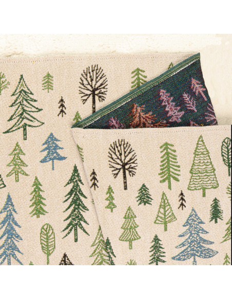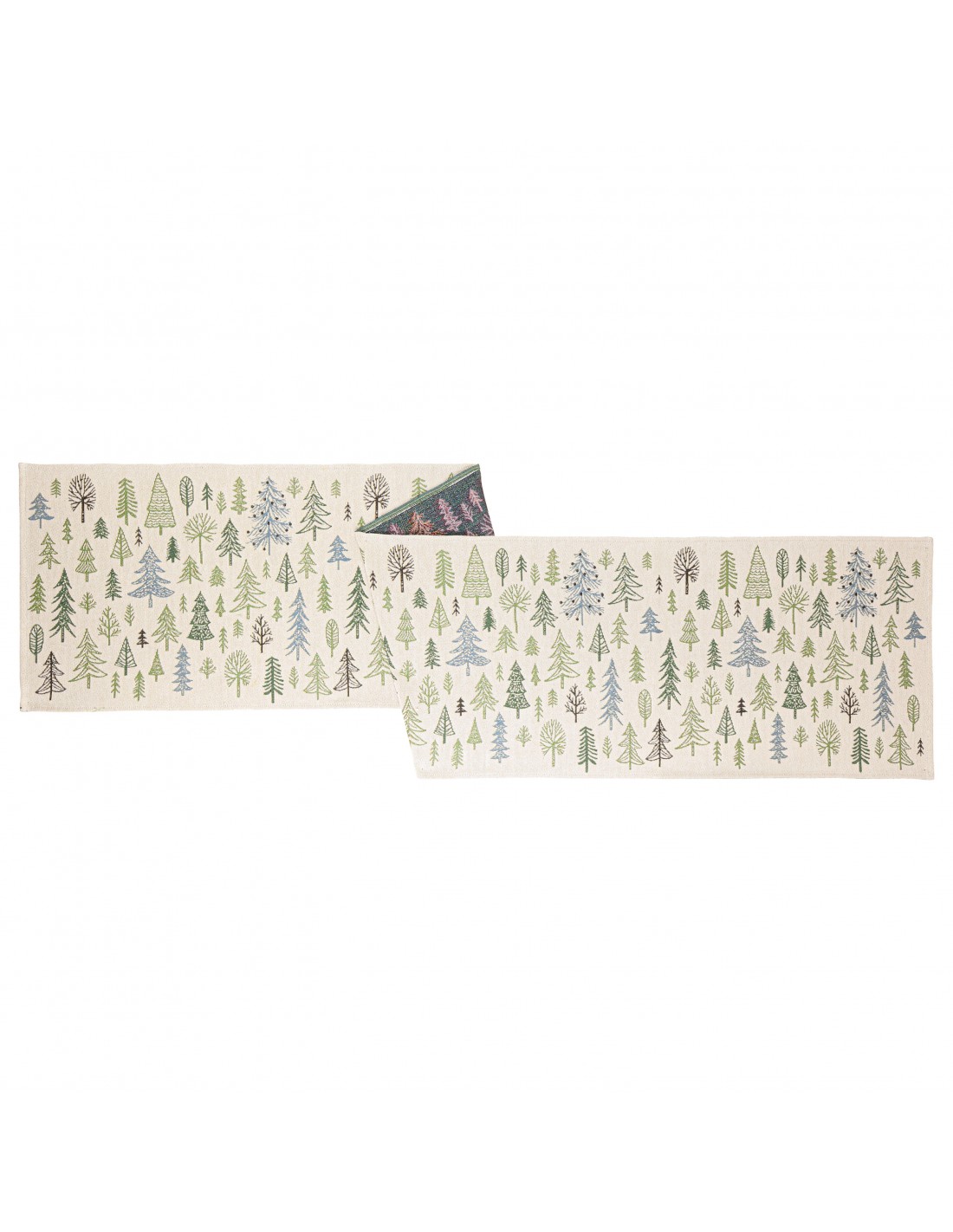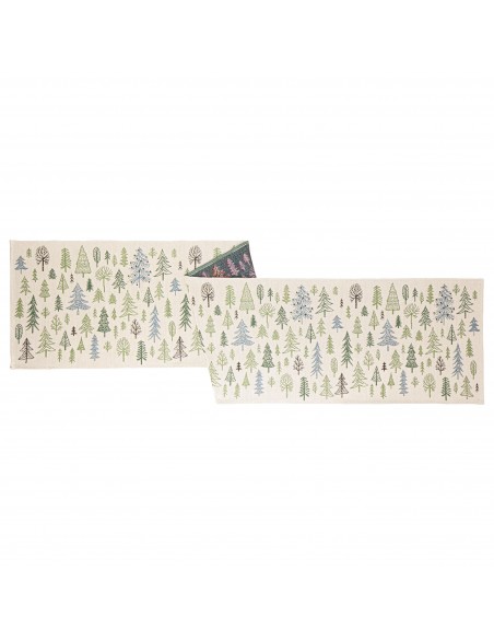 Camino de mesa con estampado de árboles en distintos tonos verdes, azules y marrones sobre fondo claro. Perfecto para decorar mesas en invierno o durante la temporada navideña con un estilo más sutil y nórdico.