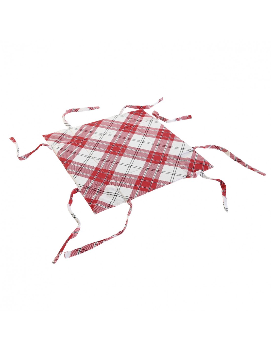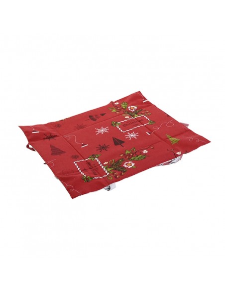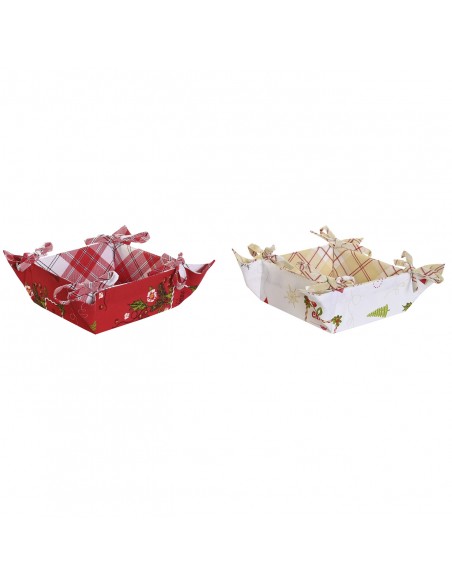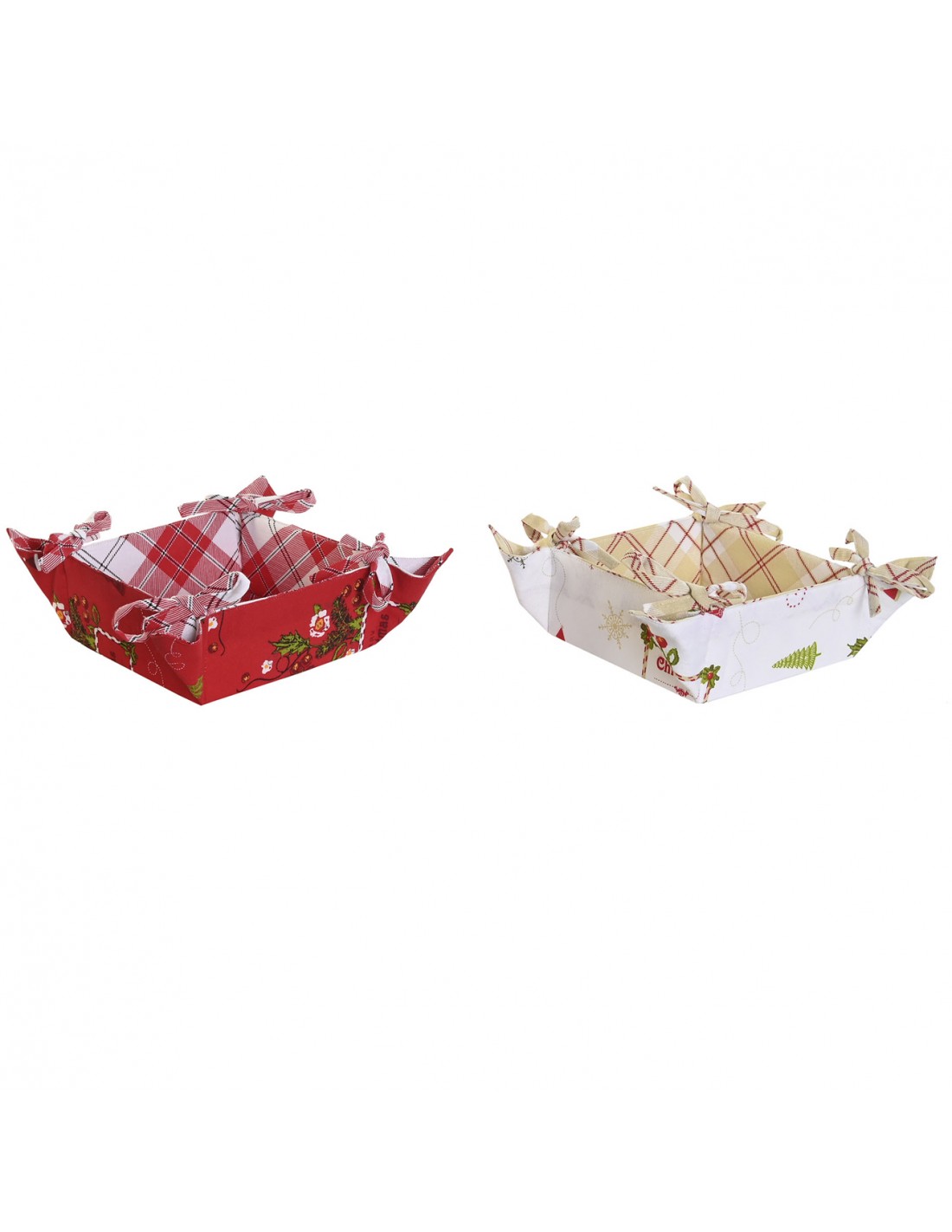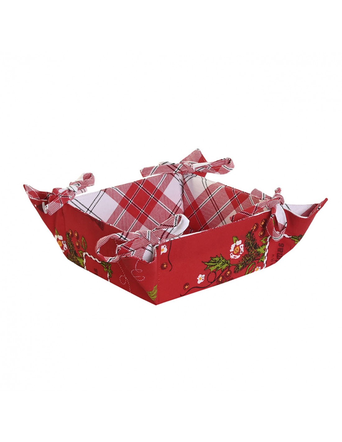 Cesta cuadrada de tela con estampado navideño y lazos decorativos en las esquinas para dar forma y estilo.