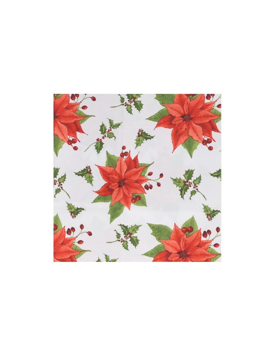 Mantel navideño de poliéster con un precioso estampado de flores de Pascua, hojas de acebo y detalles en tonos rojos y verdes sobre fondo blanco.