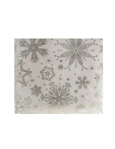 Alegre mantel de mesa de color crema champagne con diseños navideños estampados de diferentes copos de nieve.