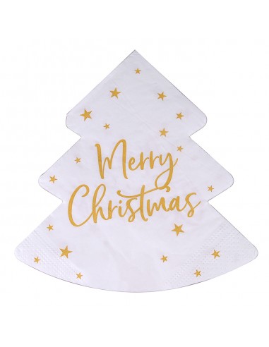 Pack de 12 servilletas de papel con una original forma de árbol de Navidad en color blanco y con la frase ¨Merry christmas¨ en dorado.