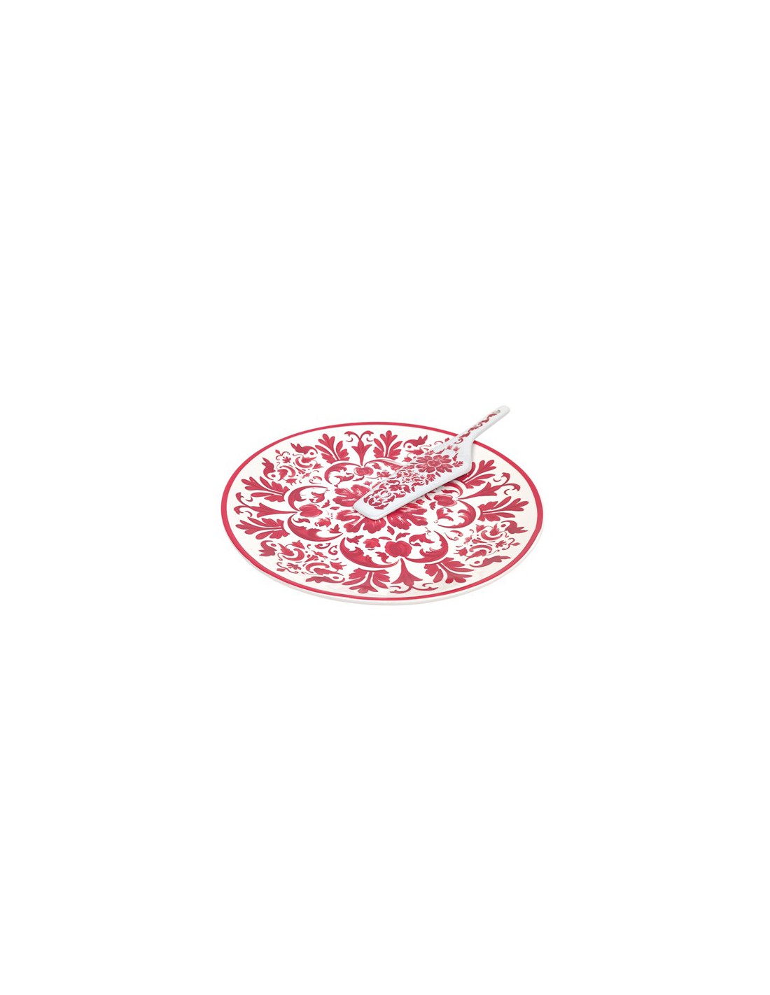 Precioso set de plato redondo de cerámica con diseño floral en tonos rojizos y paleta a juego.