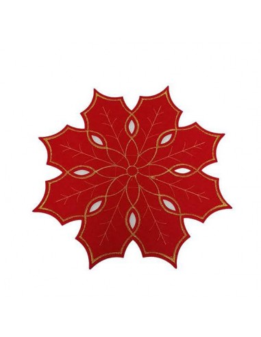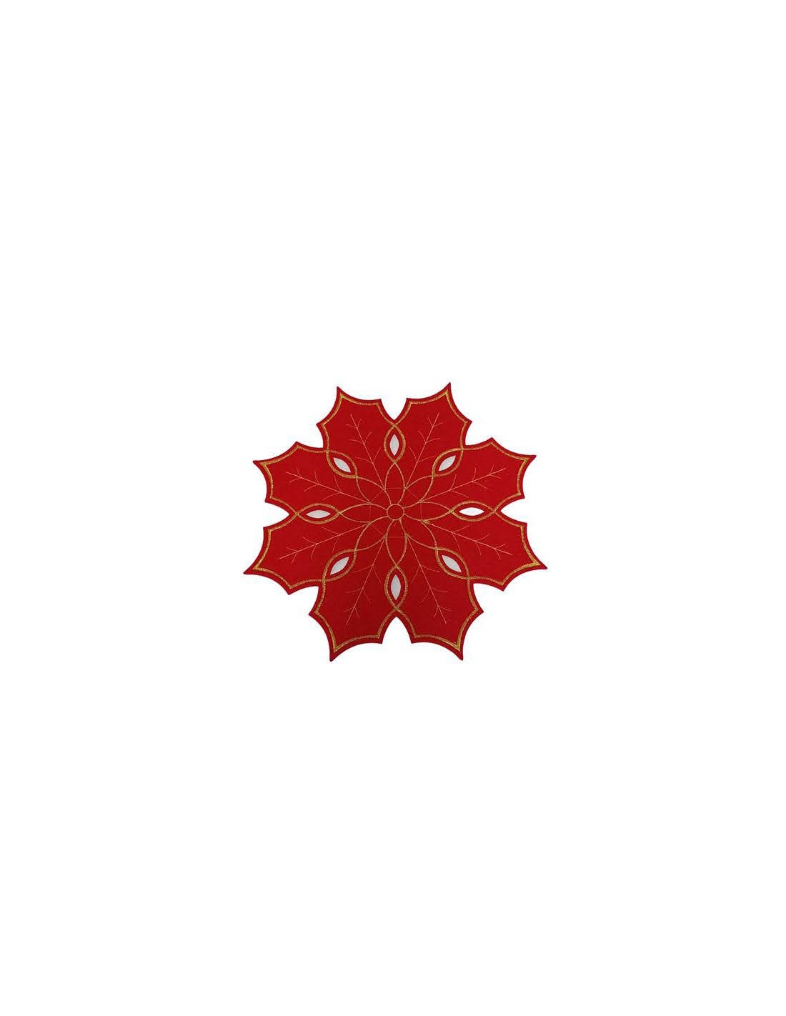 Decorativo salvamantel navideño fabricado en fieltro rojo con forma de flor y delicados detalles calados en dorado.