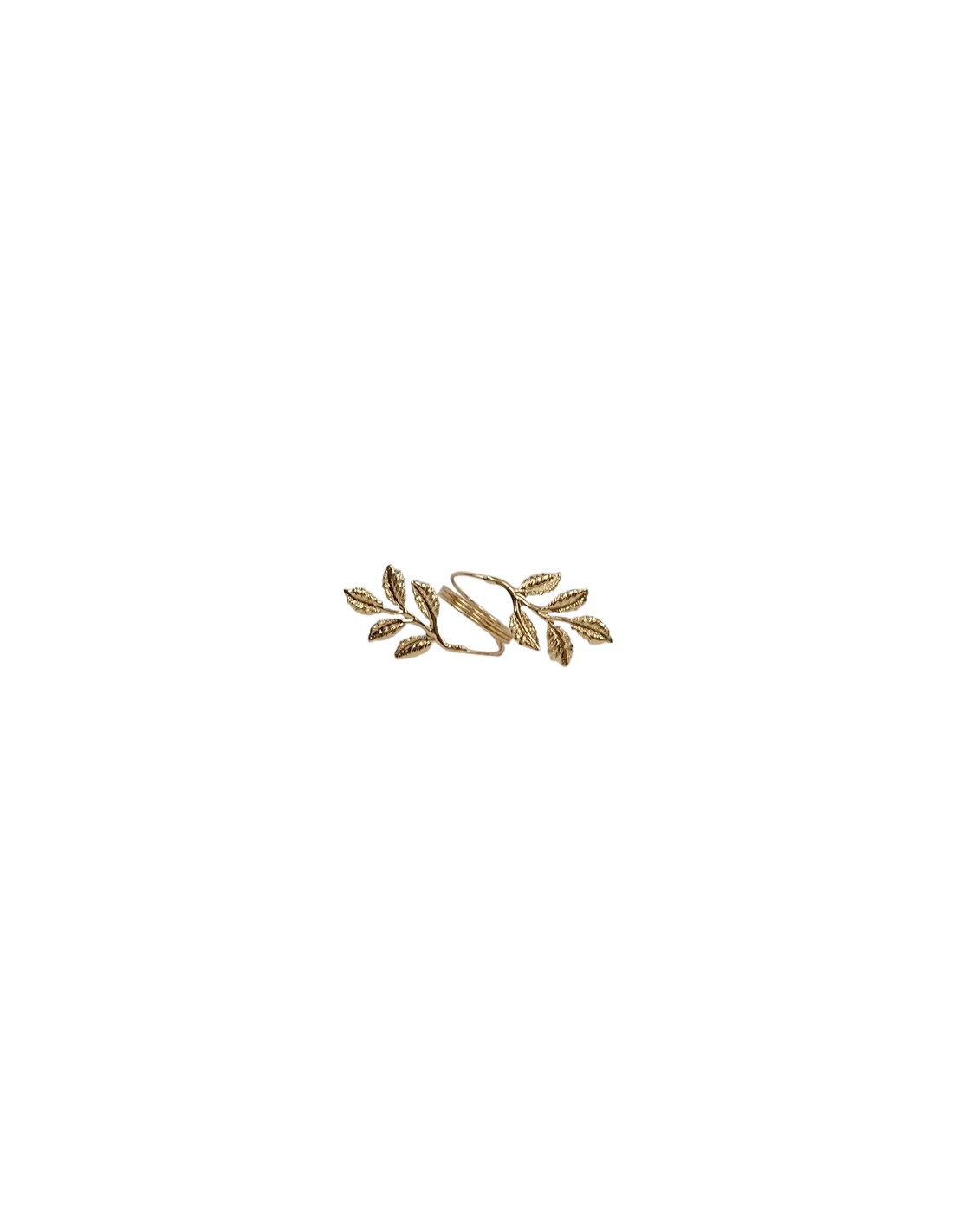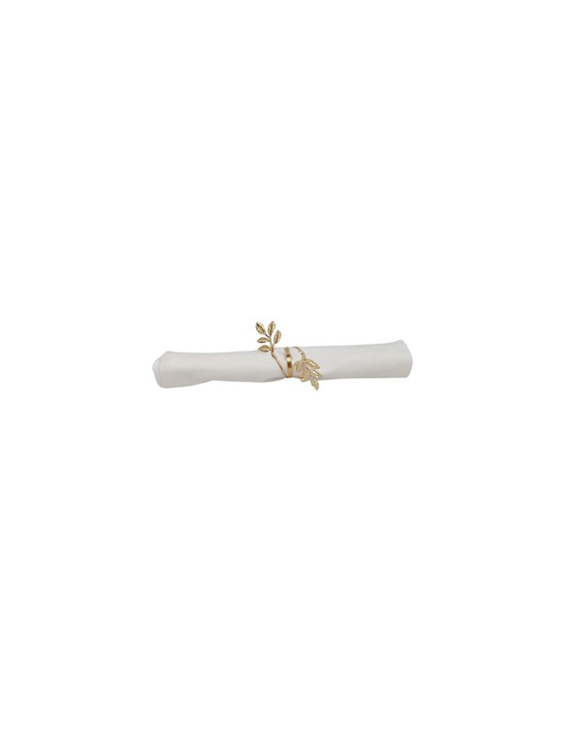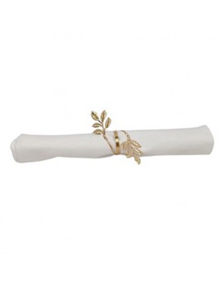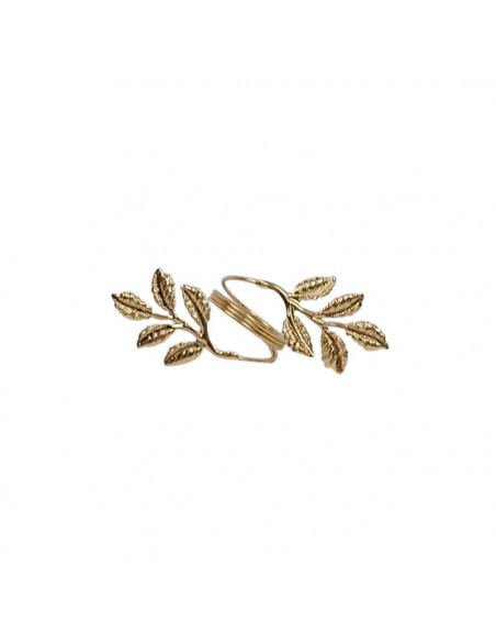 Servilletero metálico con elegante diseño de ramas y hojas en acabado dorado brillante.