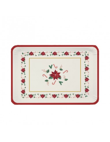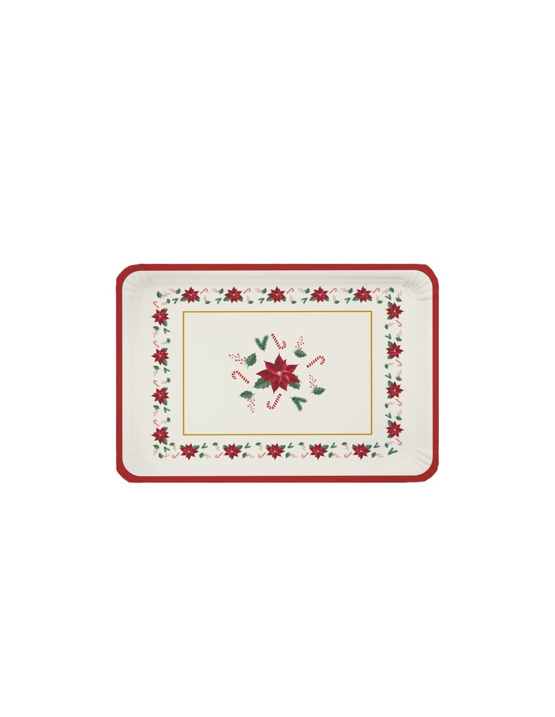 Preciosas bandejas de cartón con diseño navideño de flores de Pascua, bastones de caramelo y detalles vegetales sobre fondo claro. Con un bonito marco rojo y dorado que resalta su estilo festivo y alegre.