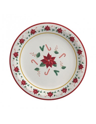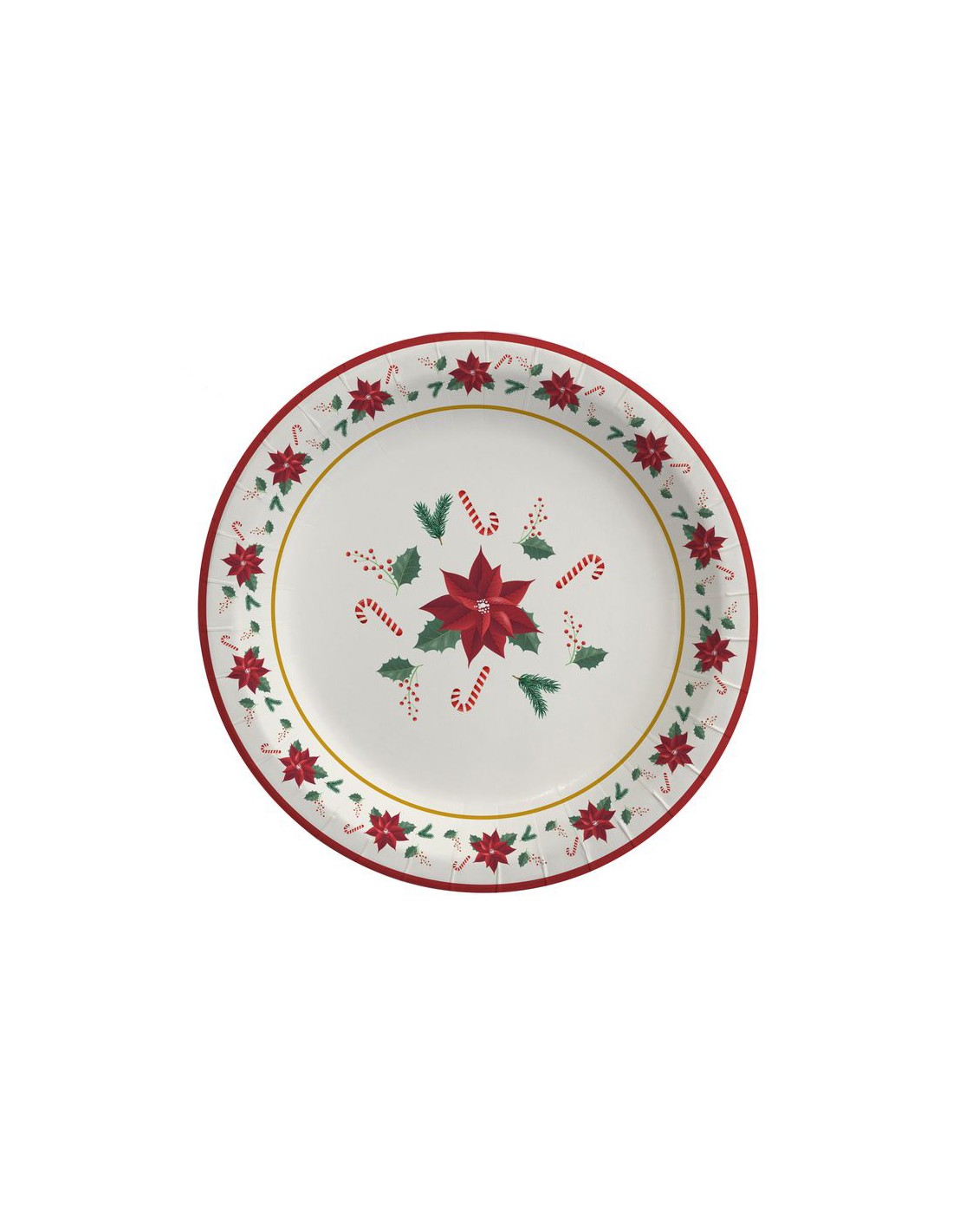 Preciosos platos de cartón con diseño navideño de flores de Pascua, bastones de caramelo, ramas de pino y acebo sobre fondo blanco. Un diseño alegre y festivo que llenará tu mesa de color y espíritu navideño.