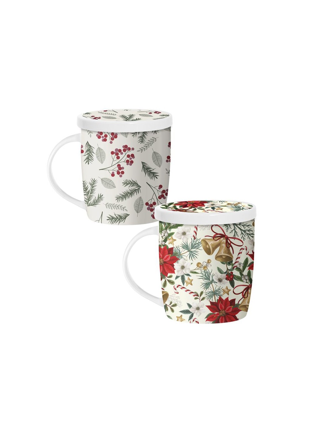 Encantadora taza para infusiones con tapa y filtro interior, decorada con motivos navideños como flores de pascua, campanas, hojas de abeto y ramitas con frutos rojos.