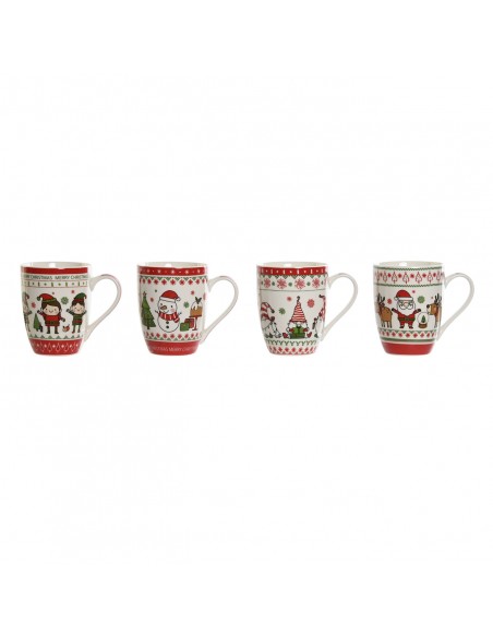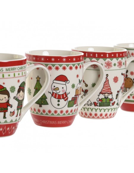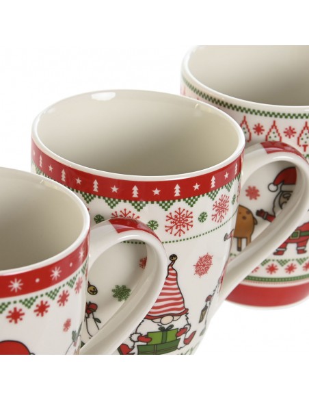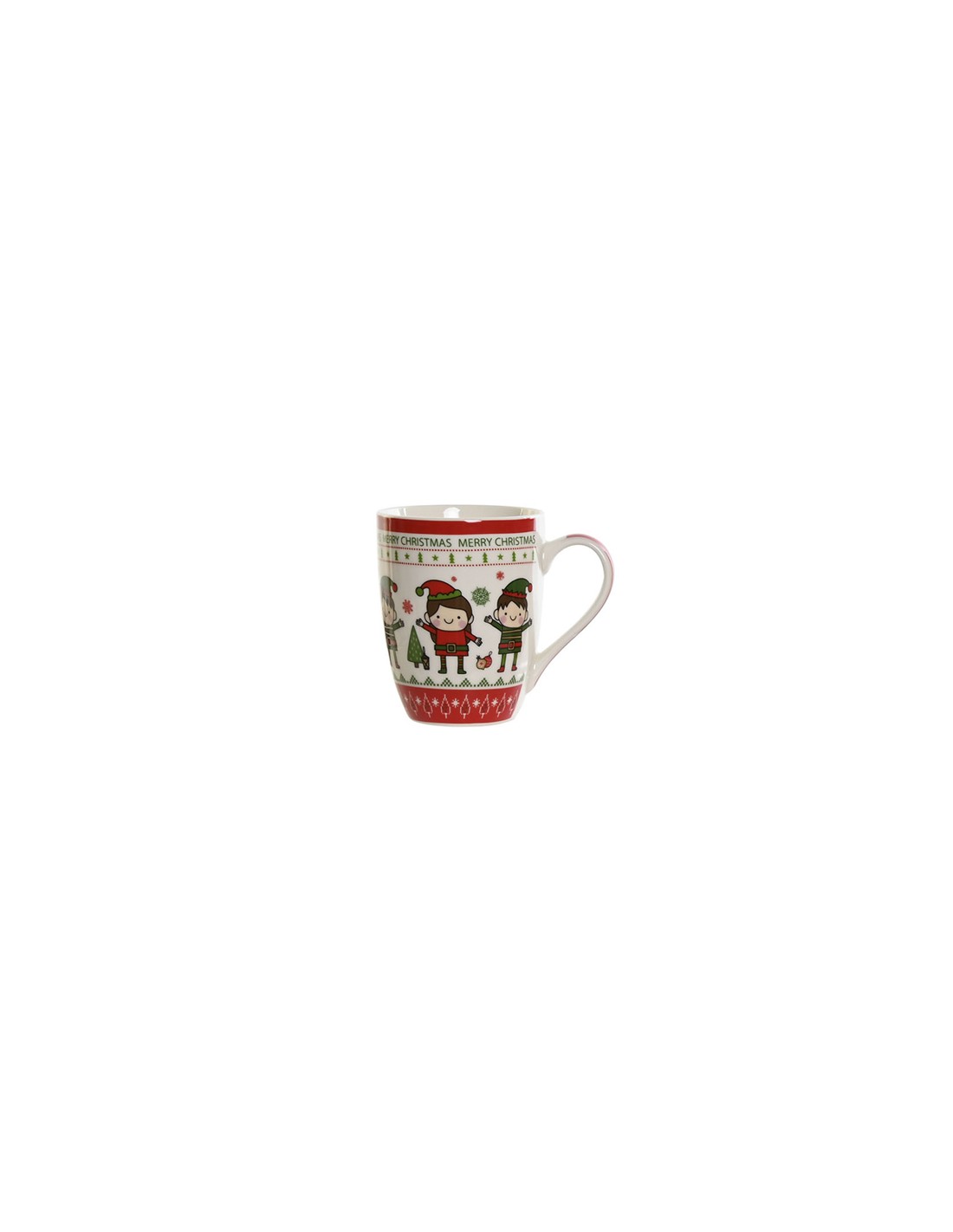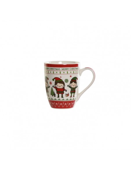 Taza de porcelana con dibujos de personajes navideños en estilo infantil y borde decorativo con motivos festivos.