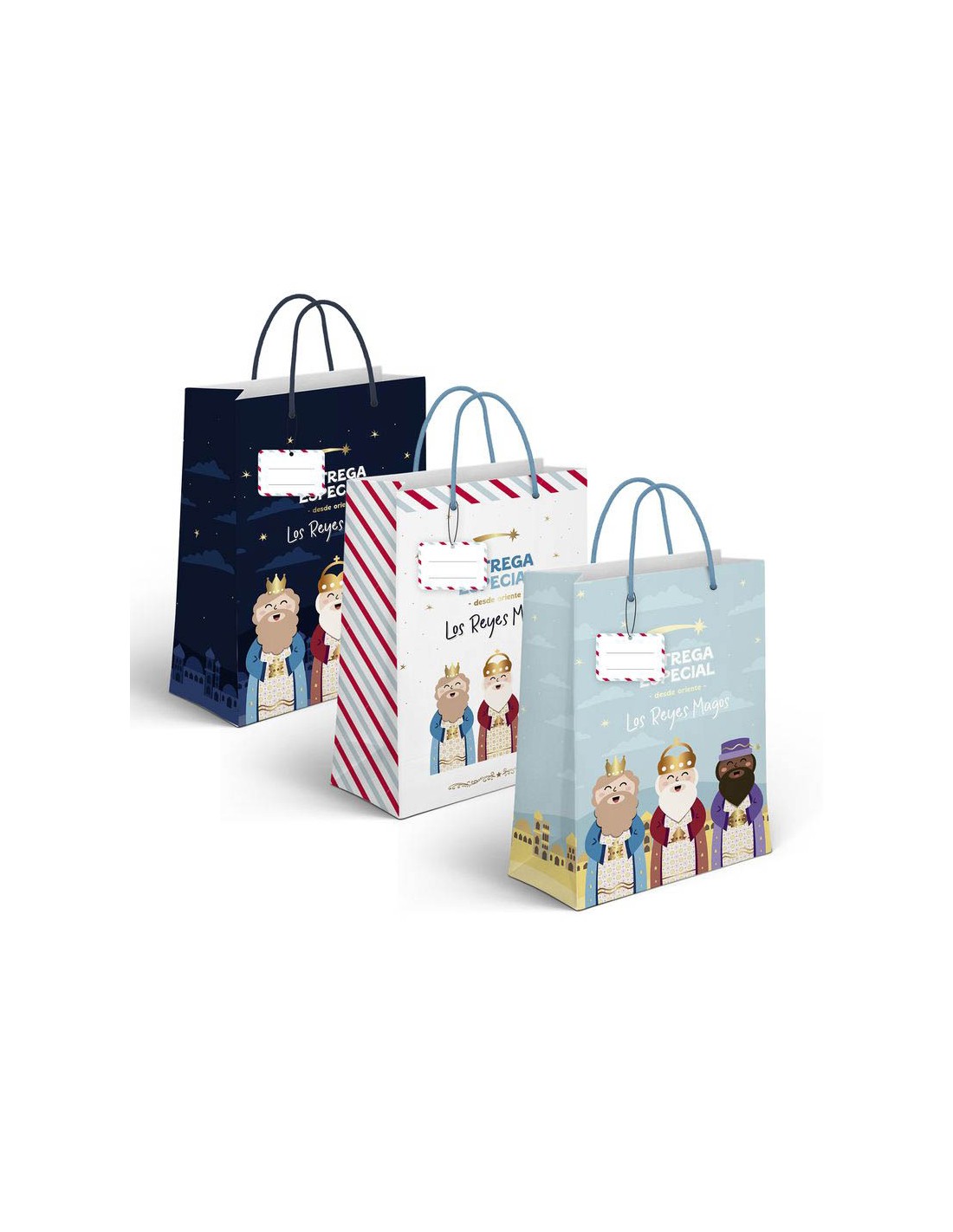 Bolsa de papel con un original y divertido diseño estampado por ambos lados de los Reyes Magos y sobre ellos la frase ¨entrega especial¨.