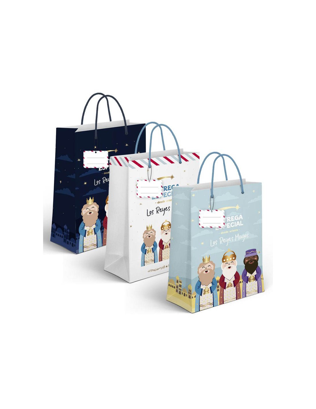 Bolsa de papel con un original y divertido diseño estampado por ambos lados de los Reyes Magos y sobre ellos la frase ¨entrega especial¨.
