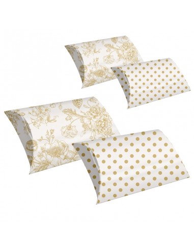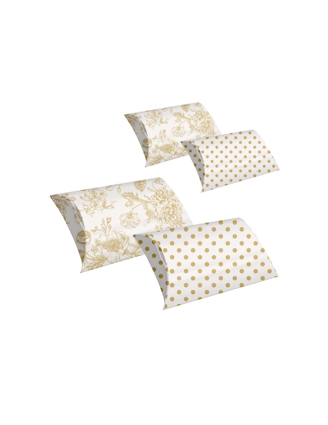 Set de 4 cajitas de regalo de cartón plegables de color blancas decoradas con un estampado dorado muy elegante.