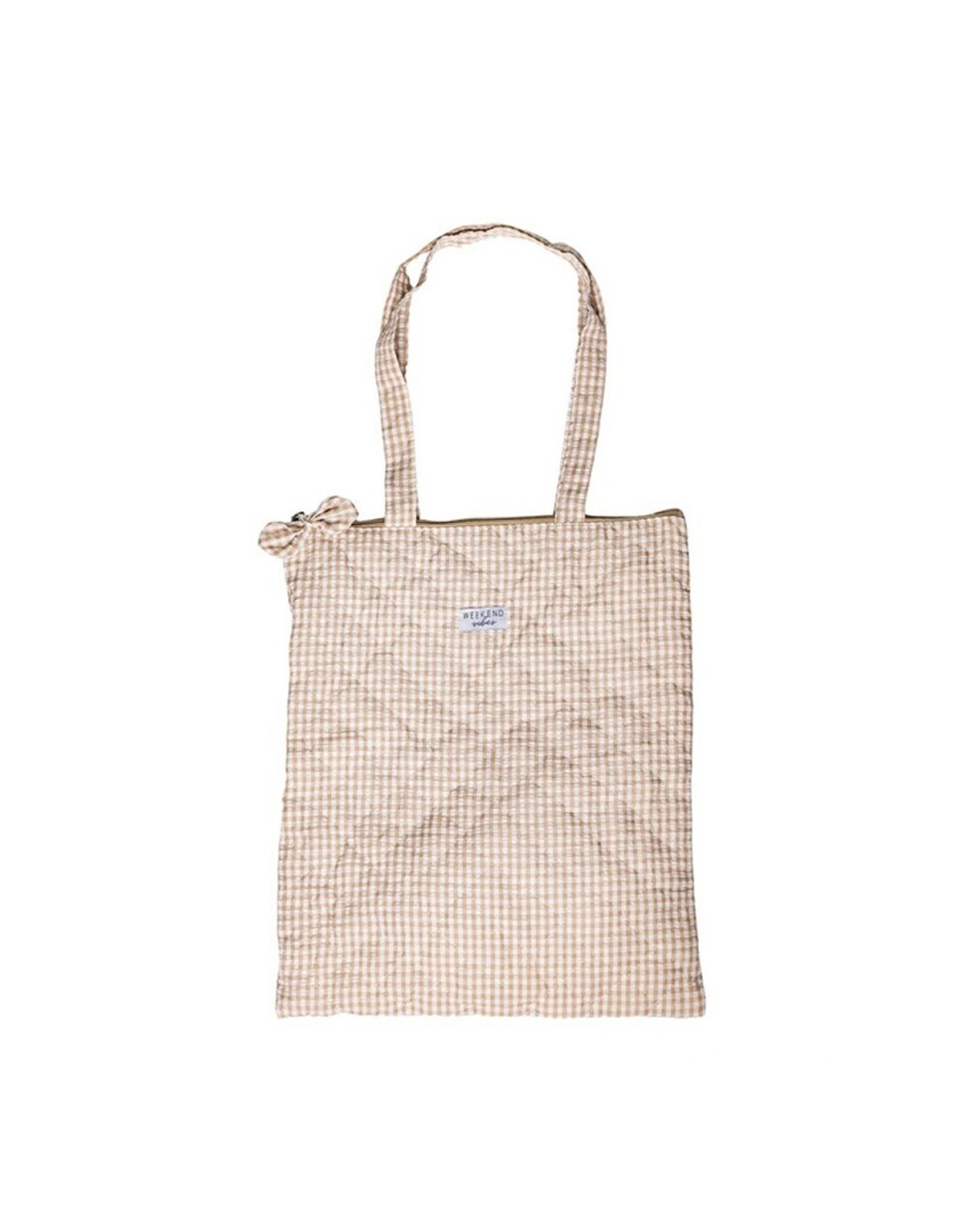 Ligera bolsa acolchada con estampado vichy, cierre de cremallera y detalle de lazo decorativo, perfecta para quienes buscan funcionalidad con un toque encantador.