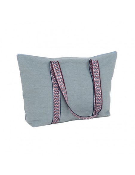 Es de color azul, tiene cierre con cremallera y dos asas para colgar cómodamente del hombro formadas por una cinta con estampado geométrico que decora todo el bolso.