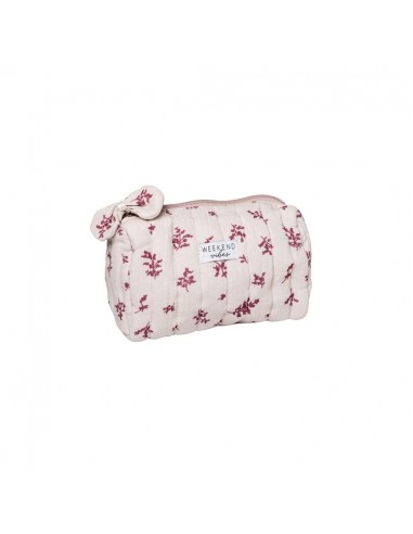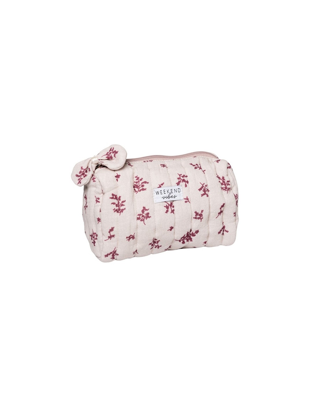 Bonito neceser acolchado con estampado de pequeñas flores en tonos burdeos sobre fondo claro, y detalle de lazo en la cremallera que le aporta un aire delicado y femenino.