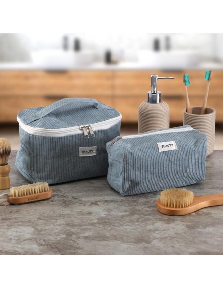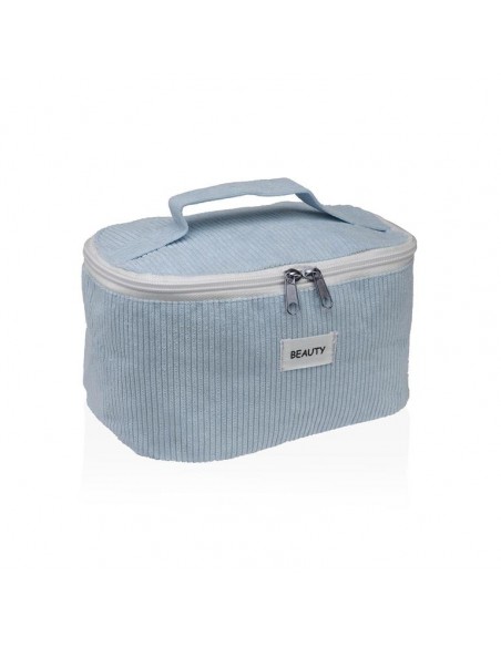 Suave neceser de tela de pana con un sencillo diseño en color azul con un cuadro central que dice ¨beauty¨.