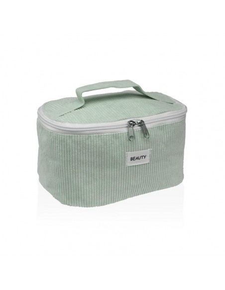 Suave neceser de tela de pana con un sencillo diseño en color verde con un cuadro central que dice ¨beauty¨.