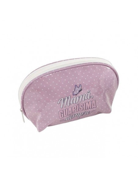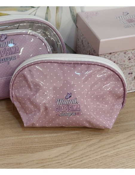 Este neceser plastificado con mensaje cariñoso y diseño de lunares en tonos suaves es perfecto para llevar cosméticos o pequeños accesorios.
