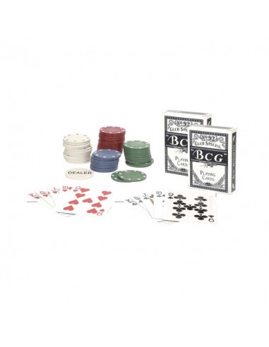 Completo set de póker con 103 piezas, que incluye fichas de distintos colores y dos barajas de cartas. Todo presentado en una resistente y decorativa caja metálica con diseño temático.