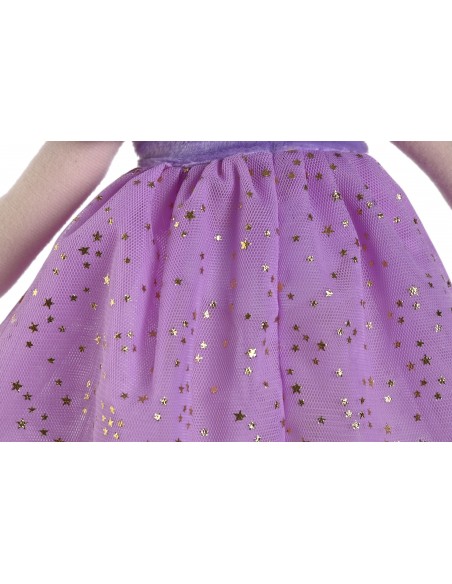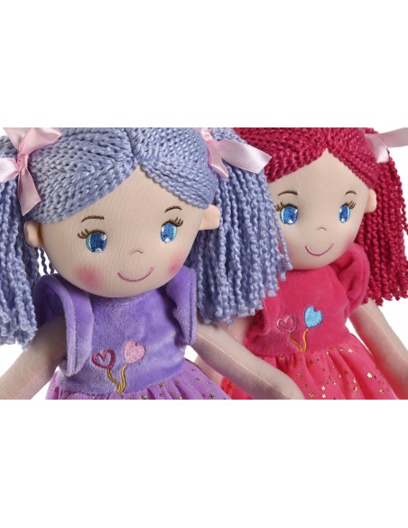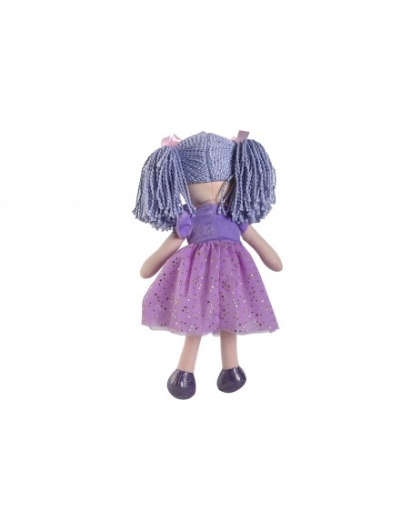 Preciosa muñeca de 40 cm y hecha de tela. Su largo pelo está recogido en dos coletas con lazos rosas, a juego con los colores de su vestido. Tiene ojos azules y una gran sonrisa en la cara que le aporta mucha alegría.
