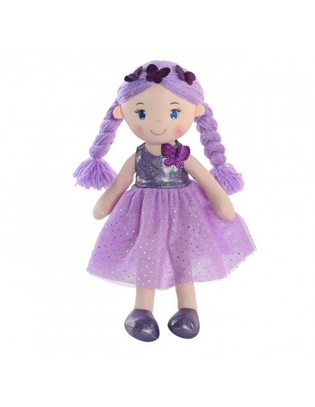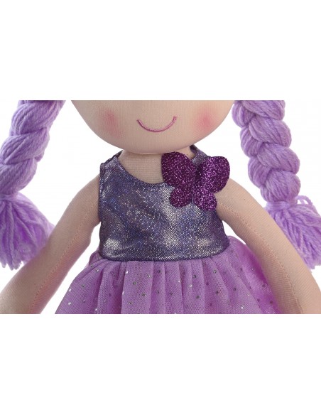 Su larga melena malva está recogida con dos trenzas y tiene ojos azules y una gran sonrisa en la cara.