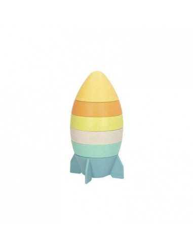 Colorido cohete apilable de 6 piezas, diseñado para encajar y construir fácilmente por manos pequeñas.