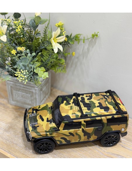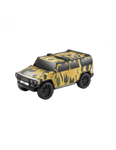 Se trata de un mini altavoz en forma de coche 4x4 con un estampado de camuflaje.