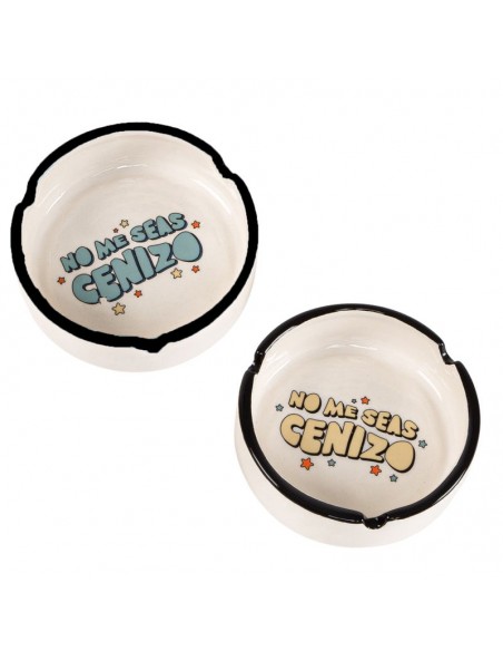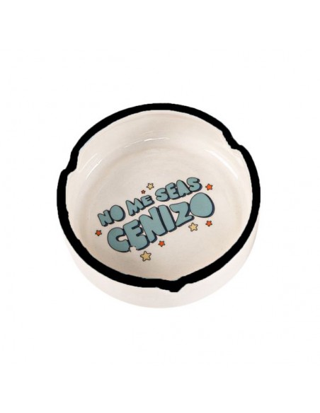 Este práctico cenicero con forma redonda está fabricado en cerámica y tien un divertido diseño que dice ¨No seas cenizo¨, una idea como regalo si un amigo se acaba de mudar.