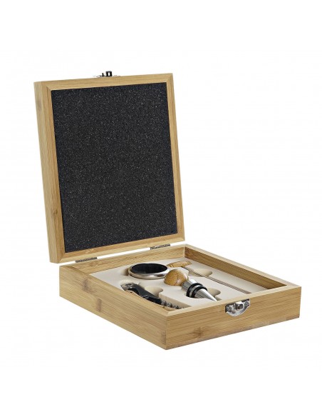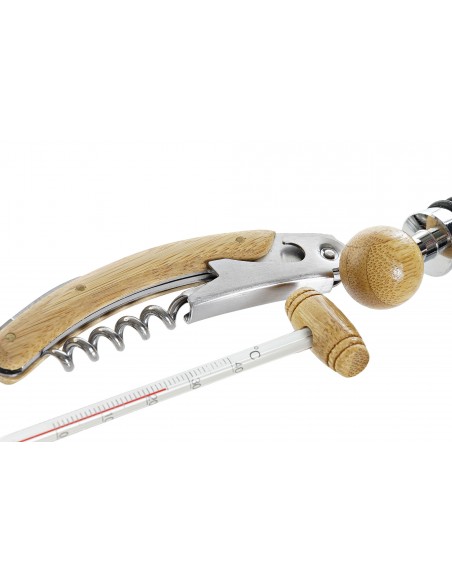 Incluye cuatro piezas: sacacorchos, tapón, termómetro y anillo antigoteo. Todas ellas están fabricadas en acero inoxidable.