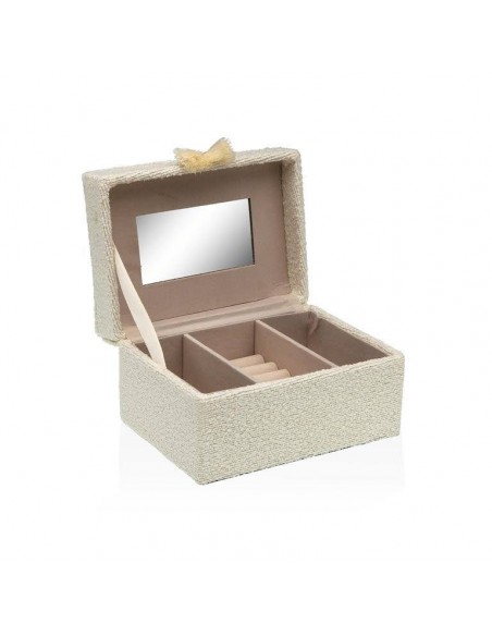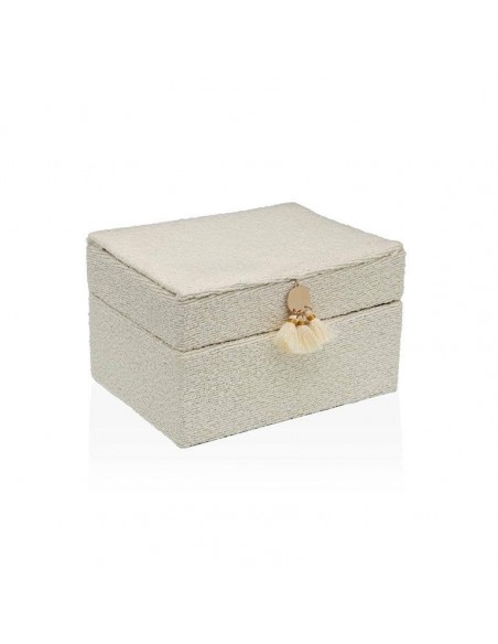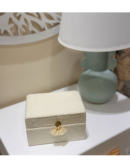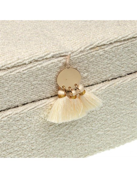 Guarda tus joyas con estilo en este precioso joyero de textura textil en tono beige. Su diseño elegante con borlas decorativas y detalles dorados lo convierte en un complemento perfecto para tu tocador.