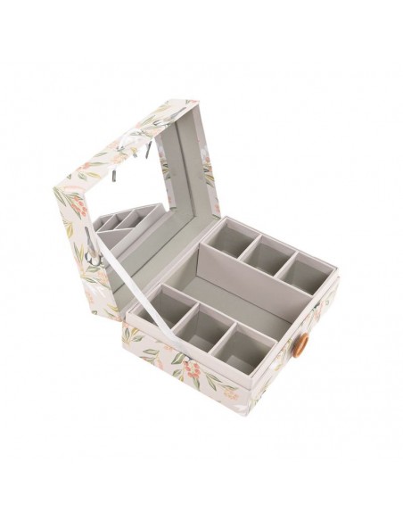Sencillo joyero rectangular de cartón con un bonito estampado de floral y de pájaros en colores pastel.