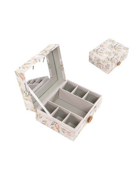 Tiene 7 compartimentos, 6 iguales y uno central más grande para organizar y guardar guardar anillos, collares y pulseras, además de un espejo para mirarse.