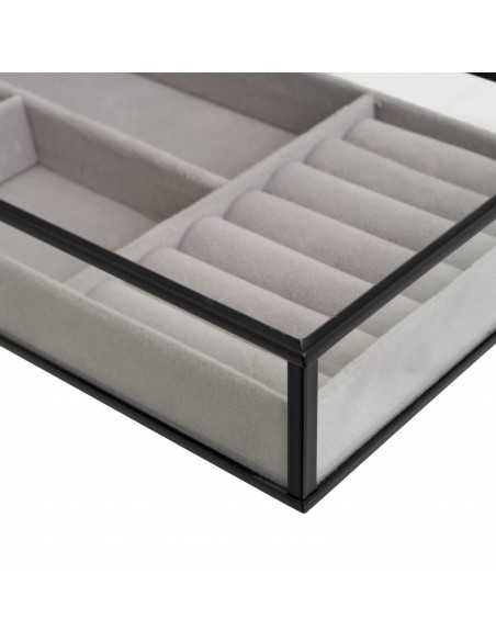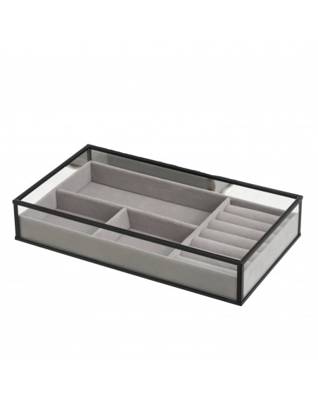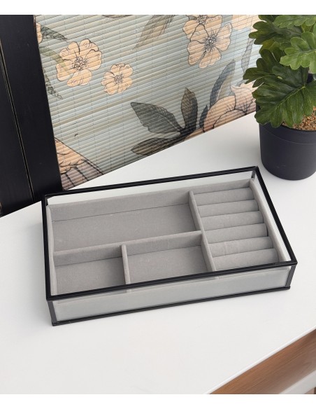 Elegante joyero rectangular con estructura de cristal transparente y marco metálico en negro.