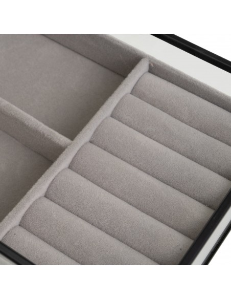Su interior está forrado en terciopelo gris suave, con compartimentos prácticos para organizar anillos, pulseras y pequeños accesorios.