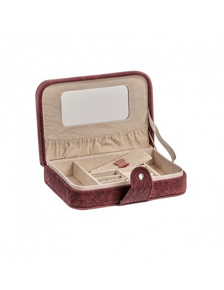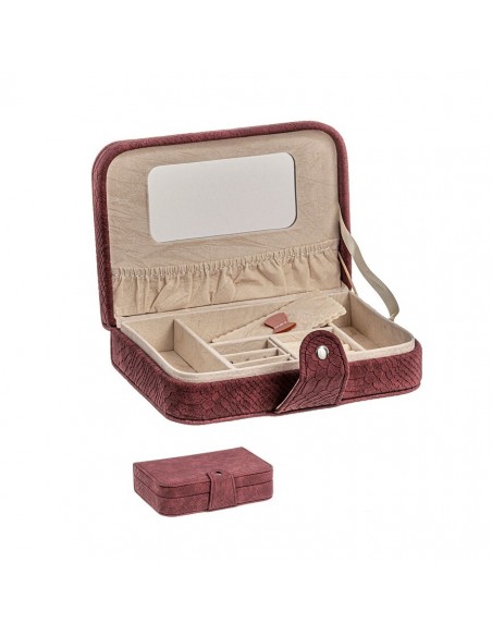 Su exterior en color burdeos con textura de serpiente le da un toque sofisticado, mientras que el interior en suave terciopelo beige incluye compartimentos para anillos, pendientes y collares.