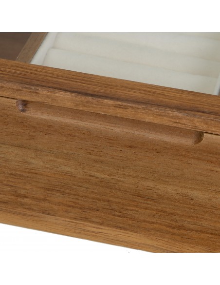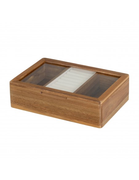 Elegante joyero rectangular de madera con tapa de cristal transparente, que permite ver el interior y mantener tus joyas organizadas con estilo.