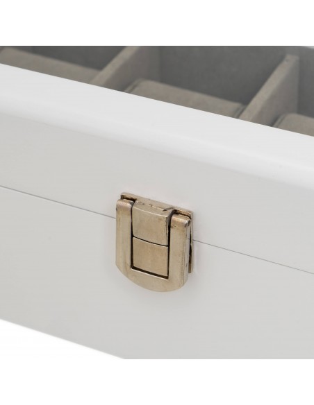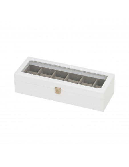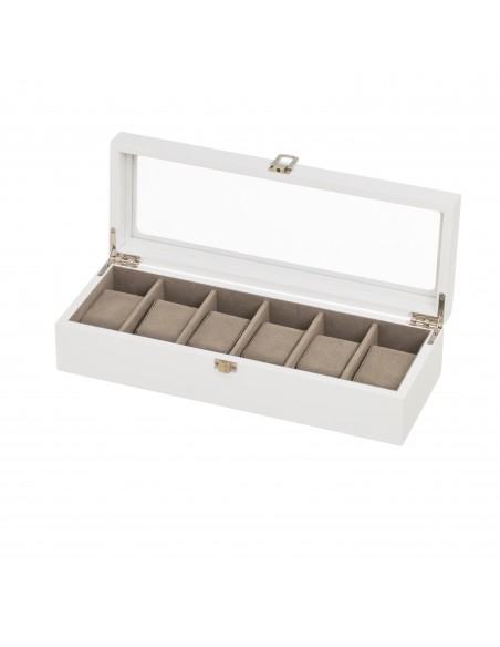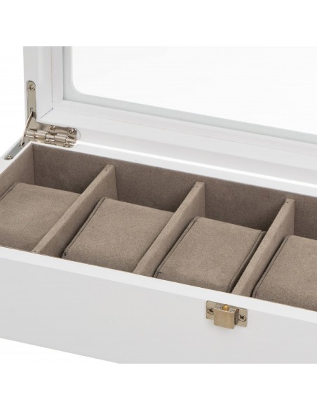 Elegante caja joyero para guadar los relojes de madera en color blanco y tiene varios departamentos para guardar hasta seis relojes.