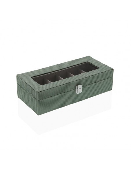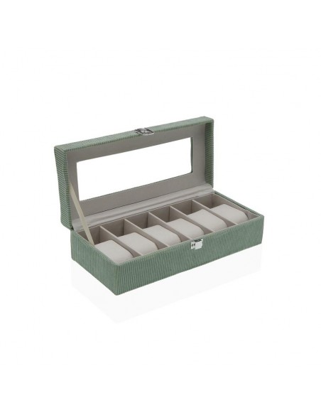 Elegante caja joyero para guadar los relojes forrada con tela de pana verde agua y tiene varios departamentos para guardar hasta seis relojes.
