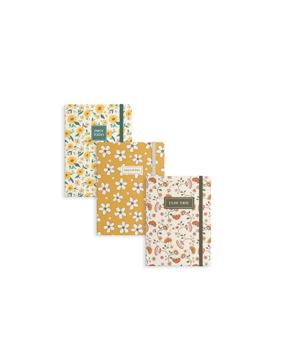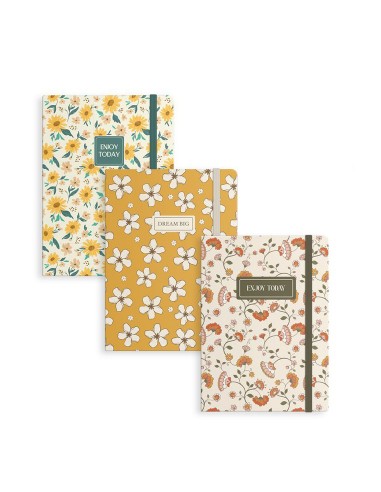 Libreta con diseño floral y mensaje inspirador en la portada, disponible en tres modelos diferentes con colores cálidos y estampados delicados.